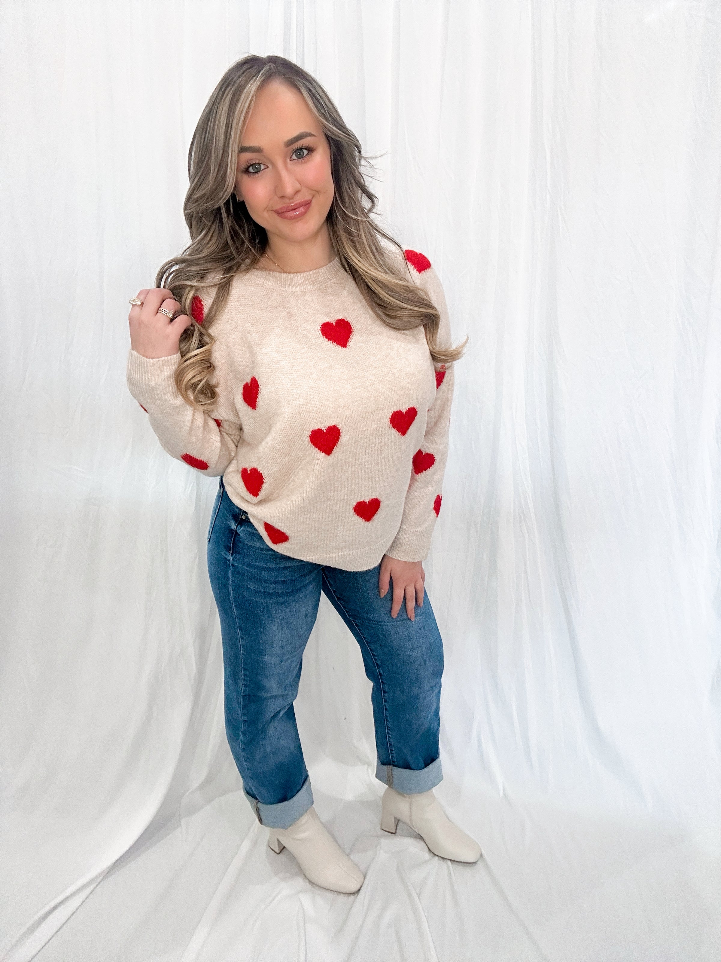 Extra soft heart detail sweater // model wearing size M/L
