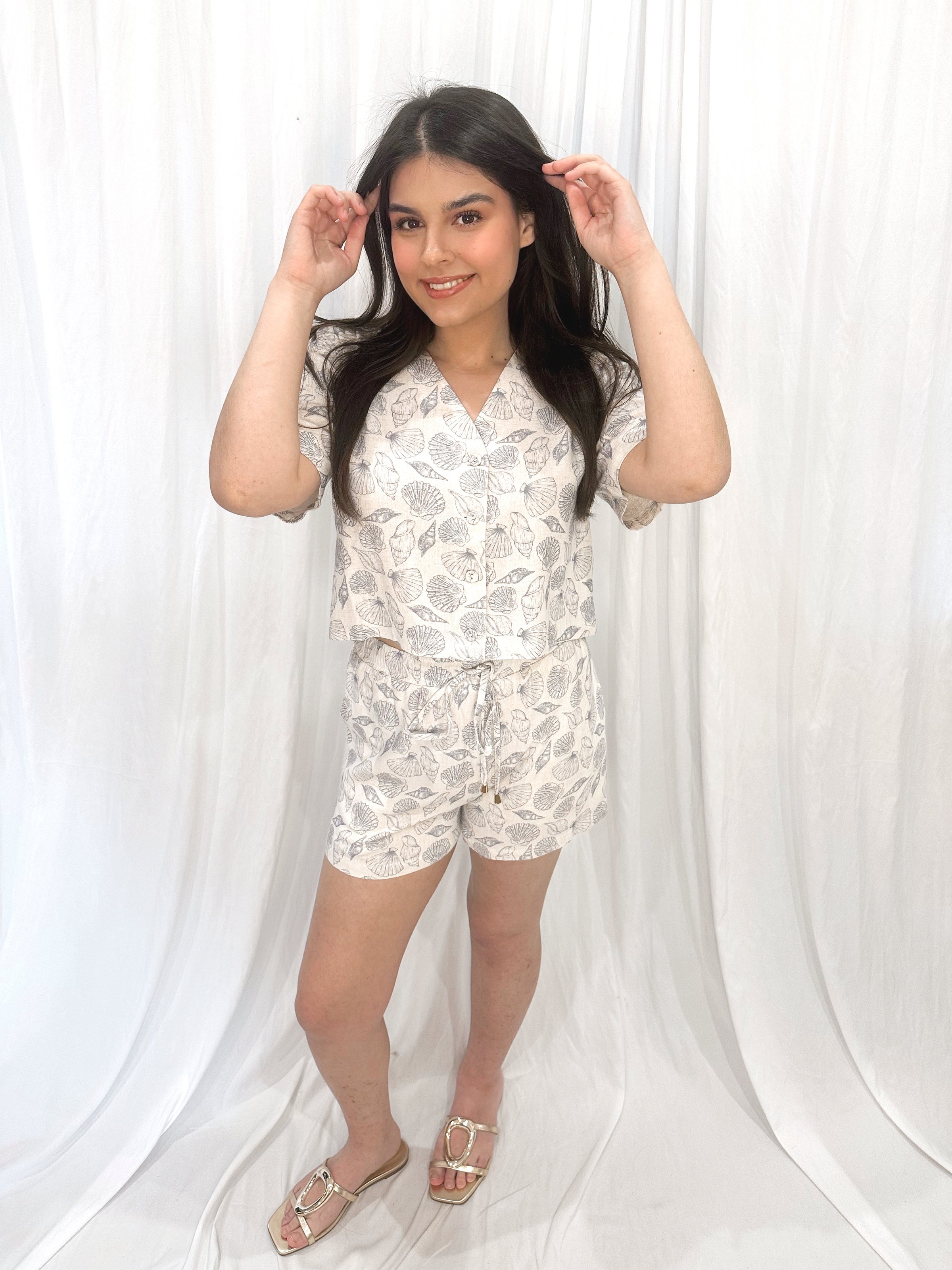 Drawstring high waisted shorts + matching V-neck top // model wearing size Small